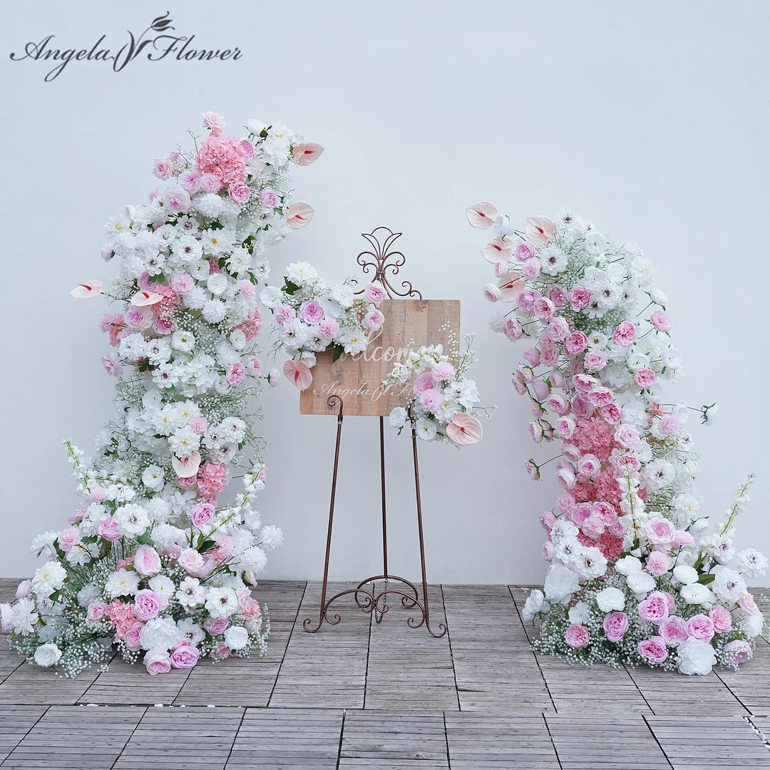 A8762 Pink White Wedding Horn Arch Floral Welcome Sign Flower Floor Row Props