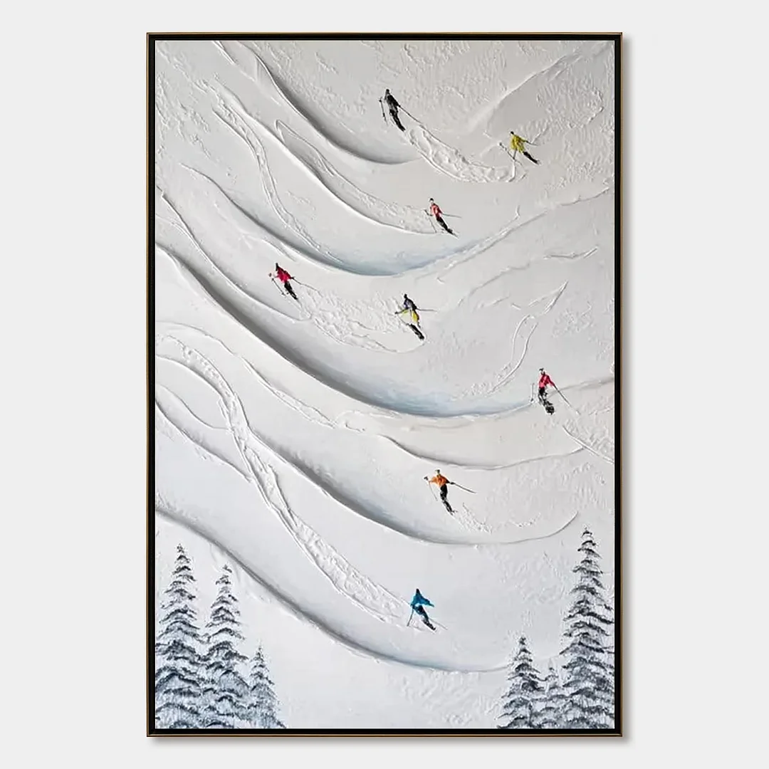 Feel the exhilarating rush of a perfect powder day with 'Alpine Rush'. Each skier, a vibrant splash of color, carves their unique path down the heavily textured, impasto slopes. The thick, tactile snow seems to rise from the canvas, inviting you to touch the crisp mountain landscape. This piece isn't just a painting; it's an infusion of pure energy and adventure for your living room, office, or mountain retreat. It captures the joy of the descent, transforming your wall into a window to the peak of excitement and freedom.