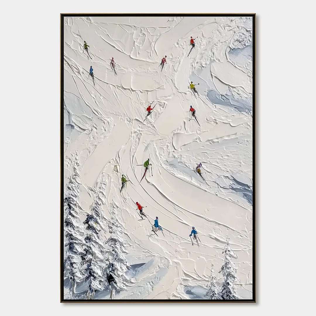 Feel the crisp mountain air and the exhilarating rush of the descent with 'Alpine Rush.' The artist uses a dynamic impasto technique, sculpting thick layers of pure white and vibrant color with a palette knife to create a tangible sense of speed and texture. Each skier carves a unique path down the pristine slope, bringing a burst of energy that animates any room. This piece isn't just a painting; it's an invitation to embrace adventure and bring the spirited atmosphere of the slopes into your home or office, inspiring movement and passion daily.