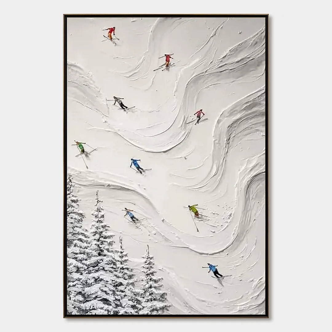 Feel the exhilarating rush of a perfect powder day with 'Alpine Rush'. From a breathtaking aerial perspective, vibrant skiers carve their unique paths down a pristine, heavily textured slope. The artist uses a masterful impasto technique, sculpting the snow with a palette knife to create a tangible sense of depth and motion. This piece isn't just a painting; it's an invitation to bring the dynamic energy and crisp, clean beauty of the mountains into your home or office, serving as a daily reminder of adventure and freedom.