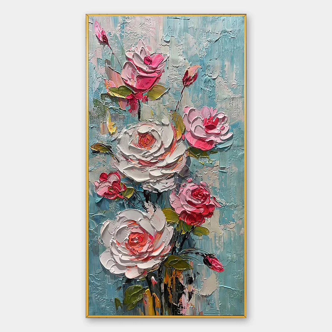 "Blushing Bouquet" captures the timeless beauty of roses in full bloom. This original oil painting features a textured, impasto application of paint, giving the flowers a three-dimensional quality. The soft pinks and whites of the roses contrast beautifully with the textured light blue background, creating a romantic and elegant piece perfect for any living room, bedroom, or hallway.