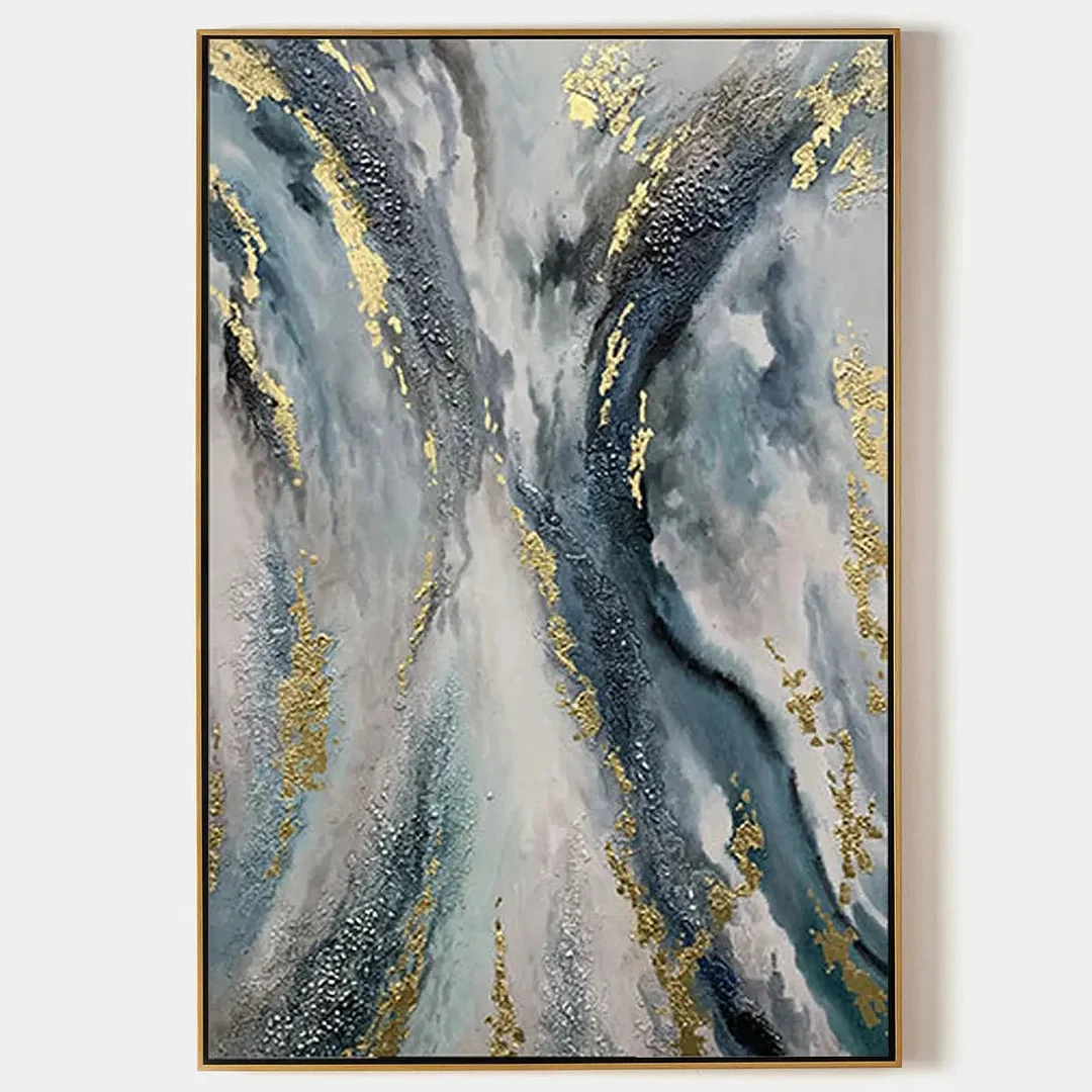 "Celestial River" invites you to drift away on a current of serene beauty. This original vertical oil painting captures the ethereal flow of abstract forms in soft blues and greys, accented with delicate gold leaf. Handcrafted with premium paints, this piece is perfect for adding a touch of tranquil elegance and otherworldly charm to any space.