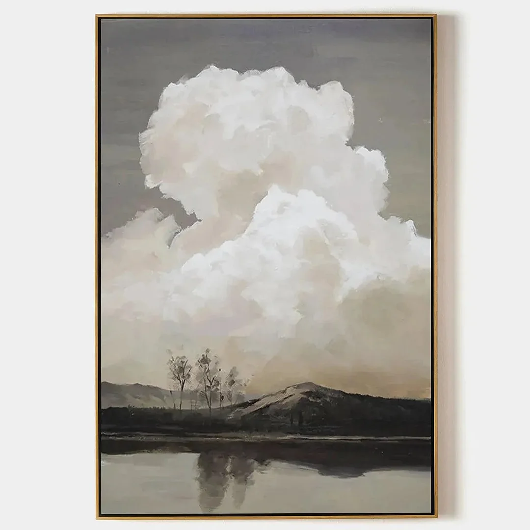 Cloudy Landscape by Liam O'Connell embodies serene beauty and the quiet majesty of nature. This vertical artwork brings a touch of tranquility and artistic flair to any living room, bedroom, or hallway. The muted tones and soft brushstrokes create a captivating visual display. The dominant presence of the clouds adds a sense of drama and depth, while the reflection in the water below creates a sense of peace and stillness. This piece is perfect for adding a touch of nature-inspired serenity and artistic expression to any space.