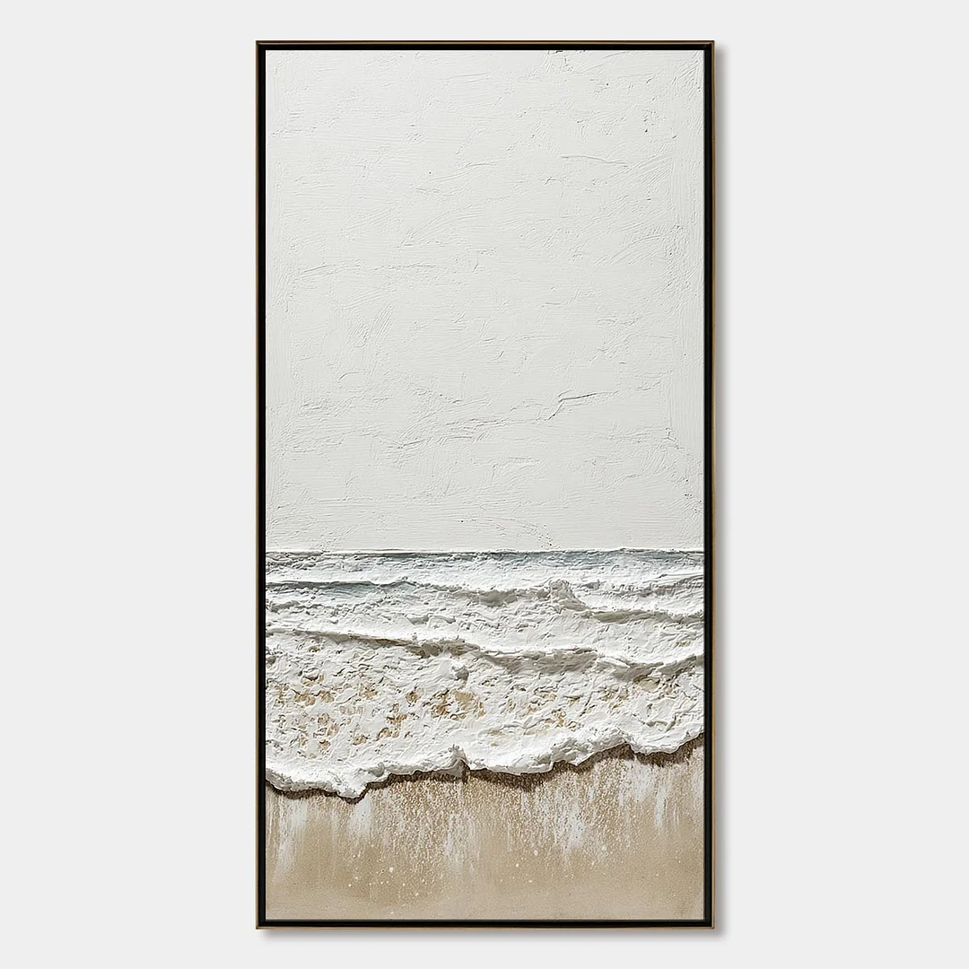 Coastal Whisper captures the serene moment the tide kisses the shore. This minimalist piece uses a heavily textured impasto technique to render the seafoam, creating a stunning, touchable contrast against the smooth beige sand and vast white sky. Embracing a Wabi Sabi aesthetic, it finds profound beauty in simplicity and natural forms. Ideal for a living room, bedroom, or office, this painting transforms your space into a tranquil coastal retreat, offering a daily moment of calm and quiet contemplation.