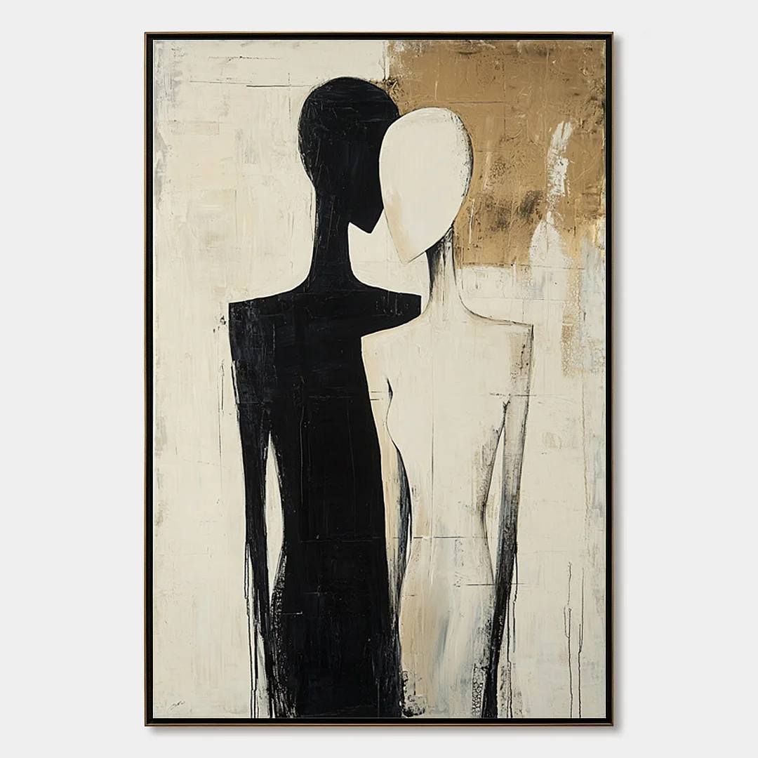 Experience the profound connection captured in "Duality," an original oil painting exploring themes of contrast and unity. Two abstract figures, rendered in bold black and white against a textured beige and gold background, create a visually striking and emotionally resonant composition. This piece invites contemplation on relationships and the balance within ourselves. Imagine it adding sophisticated depth and a touch of modern elegance to your living room, bedroom, or hallway, sparking conversation and introspection.