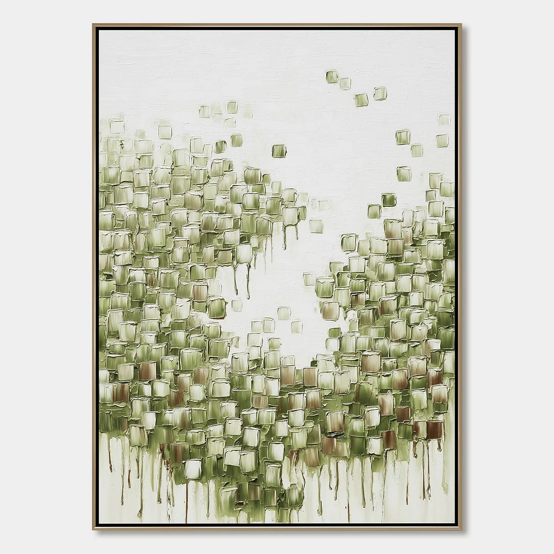 "Emerald Cascade" offers a captivating interplay of texture and color. This abstract oil painting features a cascade of textured green squares against a soft white background. The impasto technique creates a three-dimensional effect, adding depth and visual interest. The subtle dripping effect enhances the sense of movement, evoking a feeling of gentle rain or a flowing waterfall. Perfect for adding a touch of nature-inspired serenity to a modern space.