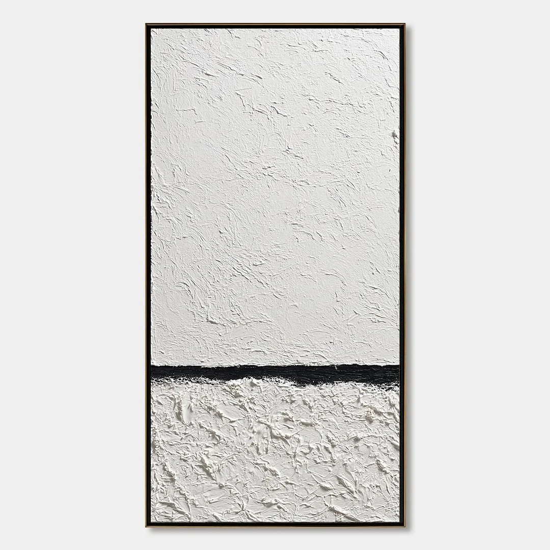"Equilibrium" embodies modern sophistication through its powerful, minimalist design. This vertical artwork creates a stunning visual impact with its stark contrast of deep black and textured white. The heavy impasto technique gives the piece a sculptural quality, inviting touch and closer inspection. A single, bold horizontal line brings a sense of calm and order, creating a perfect balance. This painting is an ideal statement piece for a contemporary living room, hallway, or a sophisticated corporate office, reflecting a clean, modern aesthetic.