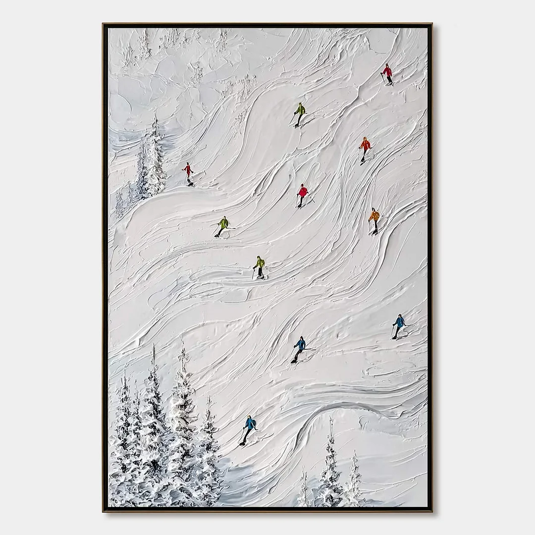 Capture the exhilarating rush of a perfect powder day with this dynamic, textured masterpiece. Each skier, a vibrant splash of color, carves their unique path down a richly impastoed slope, their energy almost palpable. Thick, sculptural strokes of paint create a tangible sense of fresh snow and rugged alpine terrain, bringing the crisp mountain air directly into your space. It's more than a painting; it's a daily reminder of adventure, freedom, and the breathtaking beauty of the mountains. Perfect for the modern home, office, or ski lodge seeking a touch of alpine spirit.