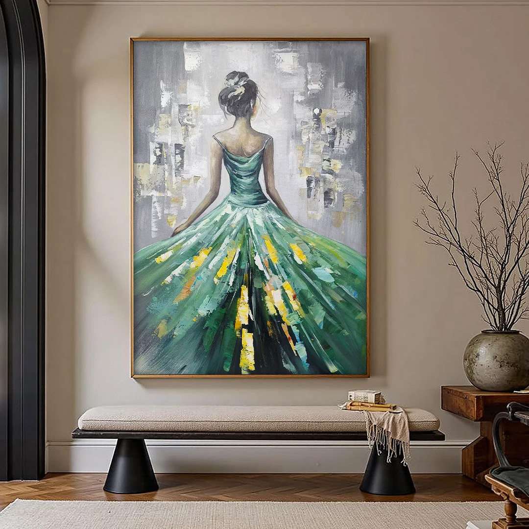 【Ready to Ship - Select Your Frame】"Emerald Grace" by Yan Nan Li is a captivating vertical painting that exudes elegance through a flowing green dress with gold details. This original artwork brings ethereal beauty and artistic sophistication to any living room, bedroom, or hallway. Your completed painting is ready to ship—simply choose your favorite frame for immediate delivery.