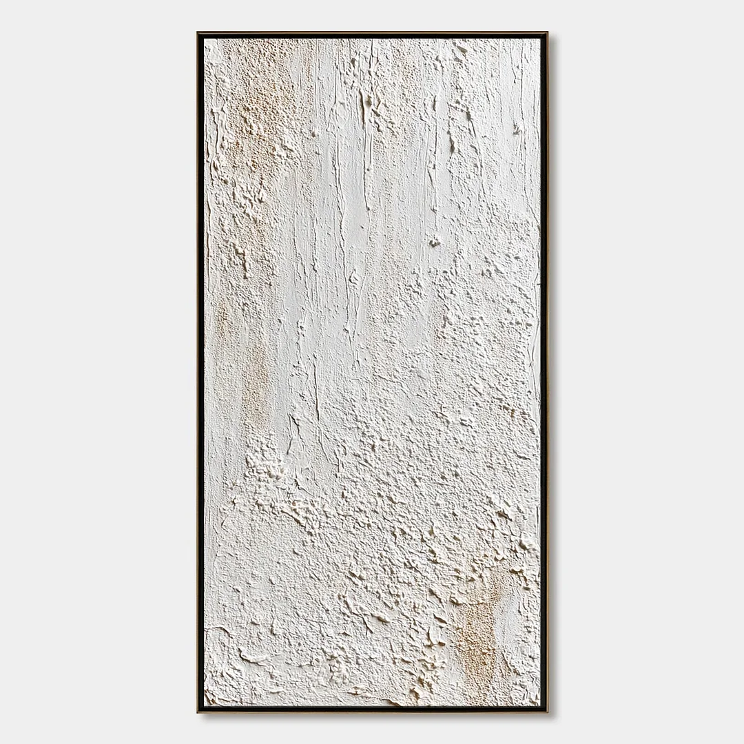 "Terra Alba" is a testament to the beauty of imperfection. This piece embraces the Wabi Sabi philosophy, celebrating raw, organic textures that feel both ancient and modern. Heavily textured layers of white and subtle beige create a tactile landscape, inviting contemplation and calm. Its minimalist composition and neutral palette make it a versatile statement piece, perfect for grounding a living room, creating a serene entryway, or adding a touch of sophisticated tranquility to an office. This vertical artwork transforms your wall into a canvas of quiet depth.