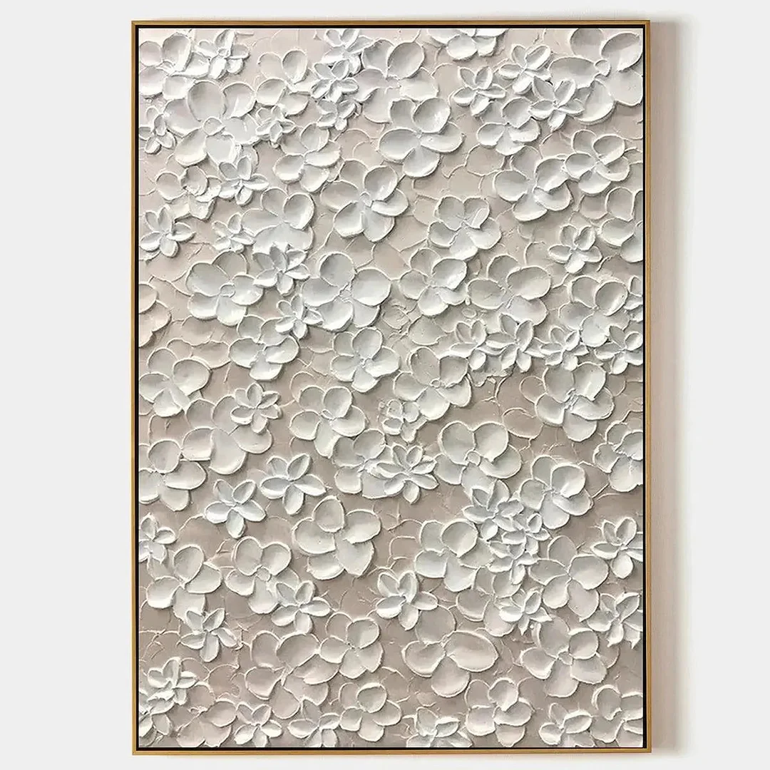 Blanc Bloom is a captivating impasto painting featuring textured white flowers on a subtle off-white background. This vertical artwork by Elodie Dubois adds a touch of Parisian charm and romantic elegance to any space. The delicate floral pattern and textured surface create a unique visual experience, perfect for bedrooms, living rooms, or dining areas.