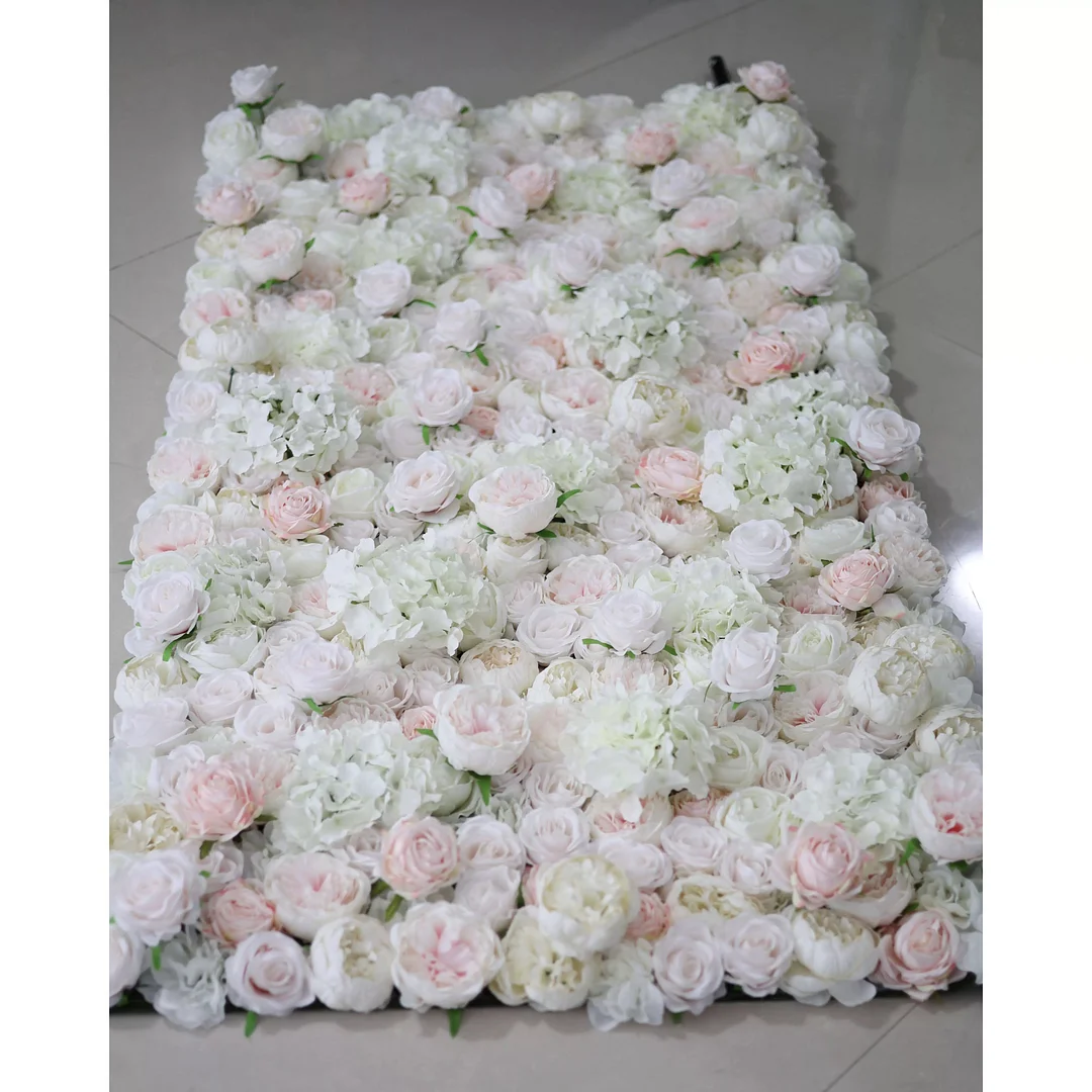 Roll Up Fabric Artificial Mixed White and Light Pink Rose Color Green Leaves Wall Wedding Backdrop, Floral Party Decor, Event Photography, Spa Decor-VF-090-2
