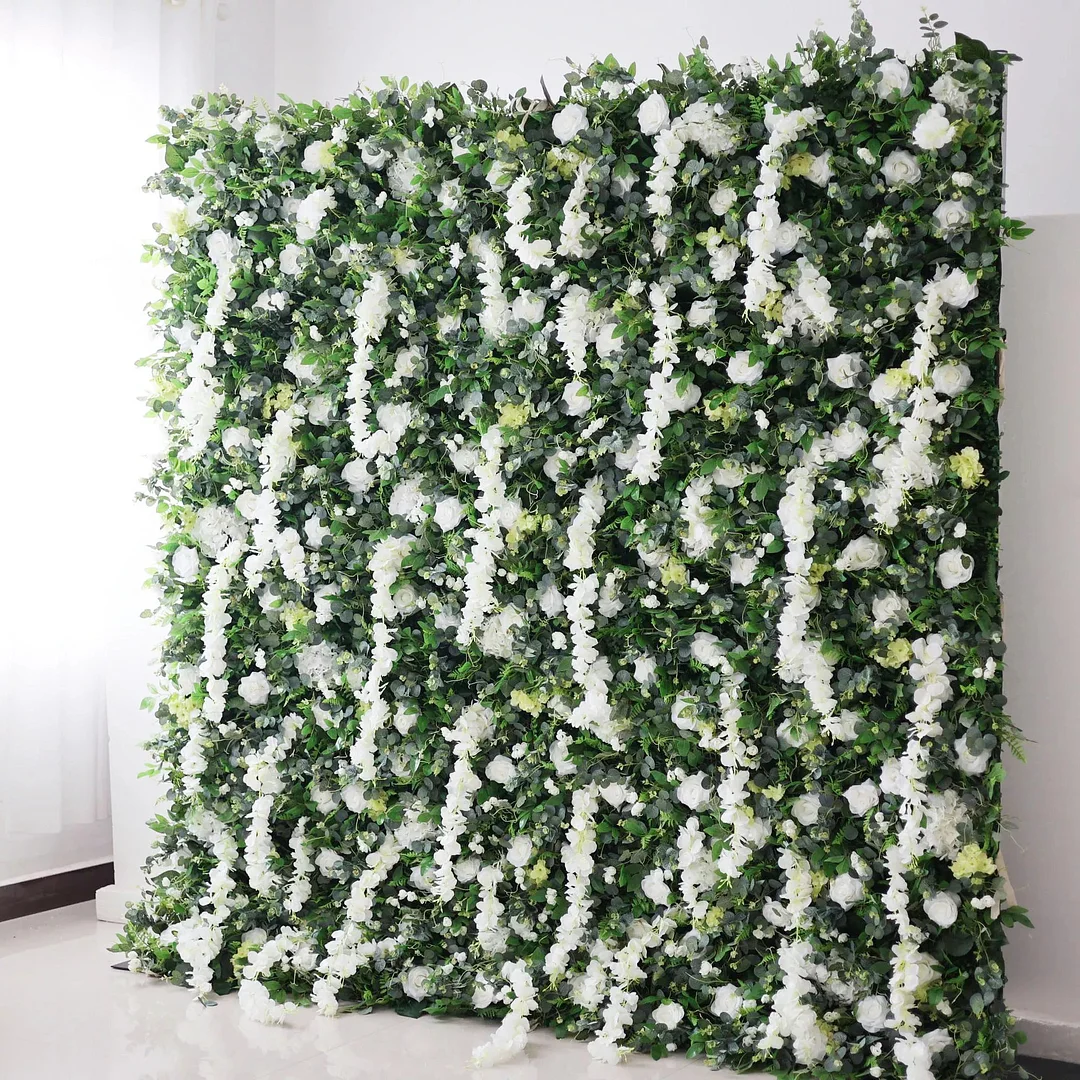 Roll Up Fabric Artificial White Flower and Vivid Green Leaves Floral Wall Wedding Backdrop, Floral Party Decor, Event Photography-VF-071