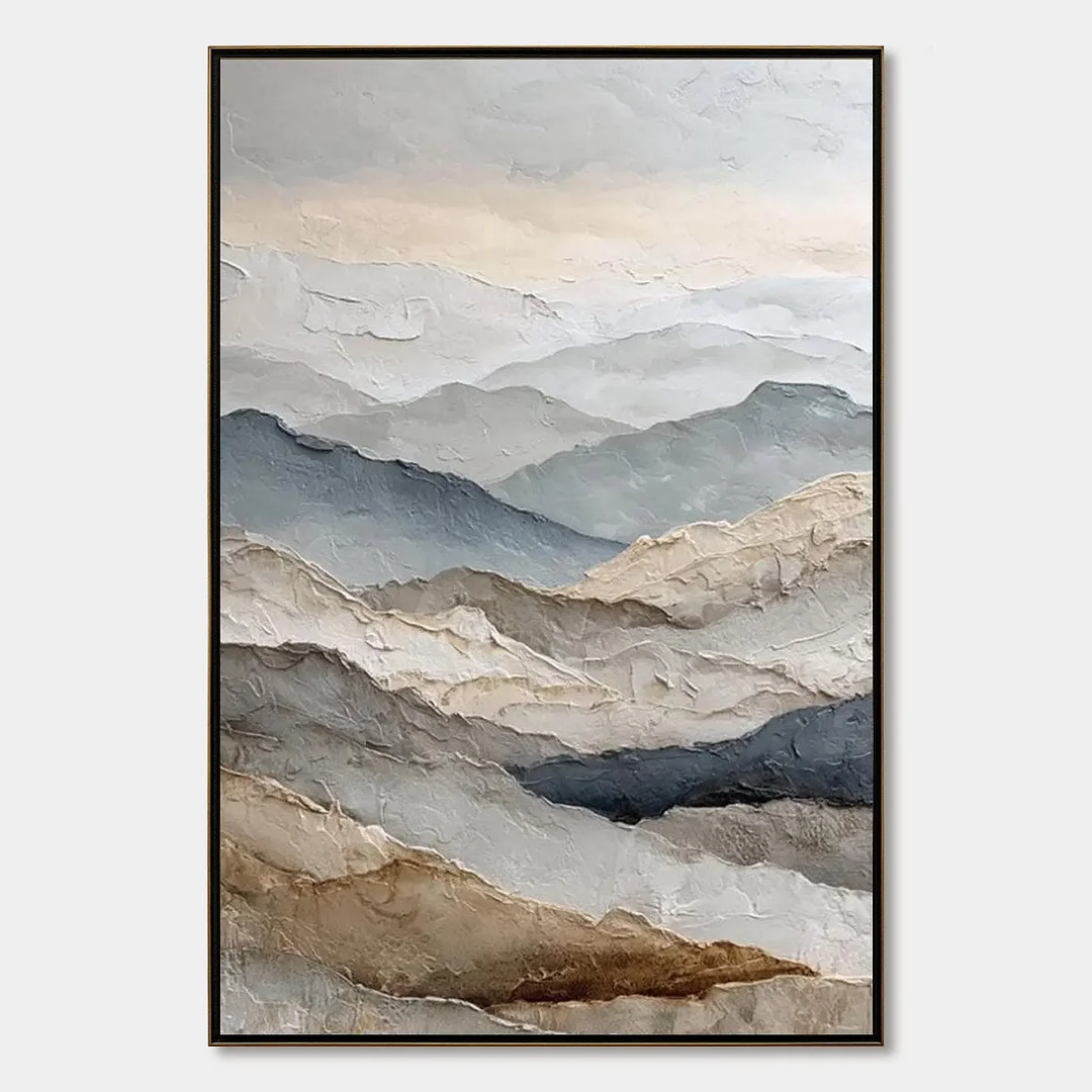 Gaze upon the quiet majesty of "Whispering Ridges." This vertical masterpiece captures layers of mountain peaks fading into a soft, hazy sky. Rendered in a soothing palette of muted greys, beiges, and earthy browns, the heavy impasto texture gives the landscape a tangible, rugged presence. Embracing a Wabi Sabi aesthetic, this painting brings the grounding, serene energy of the mountains into your space, creating a sanctuary of modern sophistication and natural calm. It’s an invitation to pause, breathe, and connect with timeless beauty.