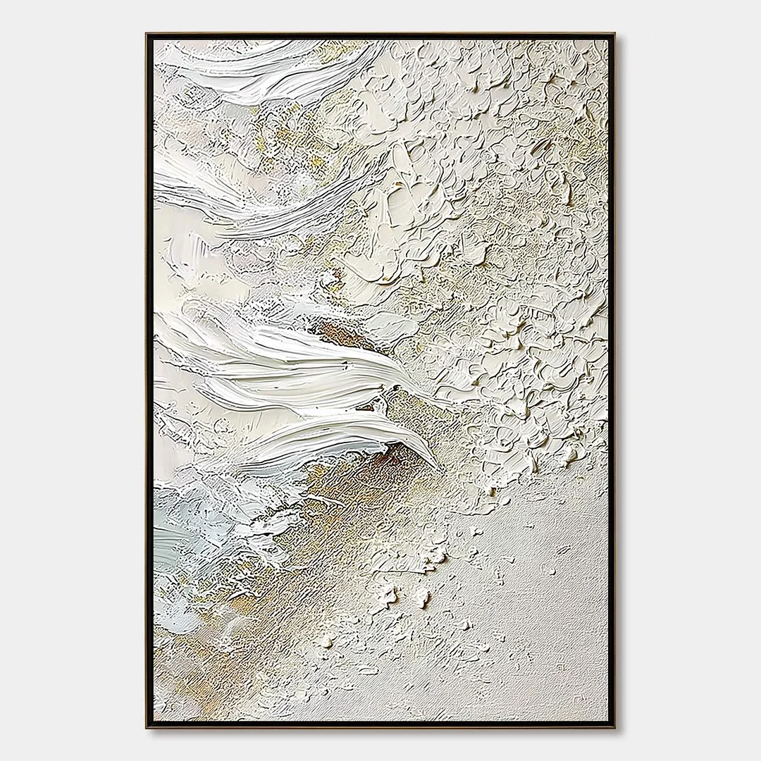 Experience the tranquil yet powerful energy of the coast, captured forever in "Whitewater Whisper." Thick, sculptural strokes of white and beige acrylic paint create a tangible sense of sea foam cresting over glistening, golden sands. This piece embraces the Wabi Sabi philosophy, finding profound beauty in nature's raw, imperfect forms. It transforms your room into a sanctuary of calm, a minimalist statement that speaks of serene shores and the quiet rhythm of the tides. More than just art for your wall, this is a daily escape to your own private coastline.