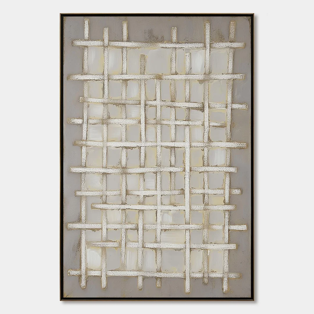 Woven Tranquility offers a serene and sophisticated exploration of texture and pattern. This minimalist abstract oil painting features a delicate interplay of interwoven lines in soft beige and white hues, creating a sense of calm and order. The subtle texture adds depth and interest without overwhelming the eye, making it a perfect addition to any space seeking a touch of understated elegance.